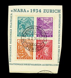 1588 O Z19-22 imageZumstein #Z19-22, 5c-20c NABA, se-tenant block of four, with a large part of the souvenir sheet still present, tied to piece by 4.X.34 Exhibition c.d.s., very fine. (Image) 580SF+