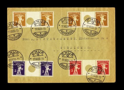 1589 c S2,5,6,11 imageZumstein #S2, S5, S6, S11, 2c and 3c William Tell, gutter pairs with large round punch, four different gutter pairs tied by "Chur/Briefversand/19.XII.35" c.d.s. postmarks on cover to Zurich, light vertical file fold not affecting stamps, very fine. (Image) 985SF