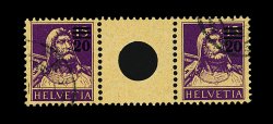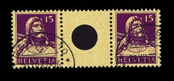 1593 O S10 imageZumstein #S10, 1914 15c Violet, gutter pair with large round punch, rich color, neat Geneva c.d.s. postmarks, very fine; a rare gutter pair to find used; signed Liniger and accompanied by his 1981 certificate. (Image) 2,850SF