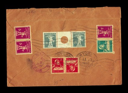 1594 c S13 imageZumstein #S13, 1918 7 1/2c Gray, gutter pair with large round punch, tied by 1930 Luzern duplex cancels along with other values to make the 80c rate on back of registered cover to Elkhart, Indiana (arrival pmk.), New York oval registry handstamps, cover with small edge faults at top, stamps very fine. (Image) 1,300SF