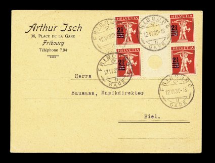 1595 c S14 imageZumstein #S14, 1921 2 1/2c on 3c Brown orange, gutter pair with large punch, block of two gutter pairs tied by "Fribourg/Gare/12.VI.30.18" c.d.s. postmarks on postcard to Biel, fresh and very fine; used multiples of the gutter pairs are very scarce. (Image) 520SF+