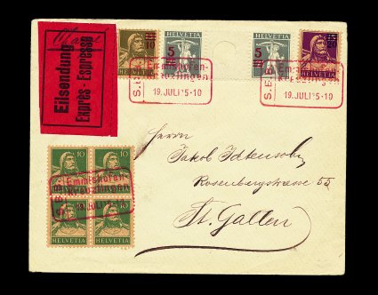1596 c S15 imageZumstein #S15, 1921 5c on 7 1/2c Gray, gutter pair with large round punch, tied by red "Emmishofen/Kreuzlingen/19.Juli 25.10" boxed cancels along with other stamps to make an 80c rate on express cover to St. Gallen (backstamp), orange express label at top left, very fine usage. (Image) 675SF