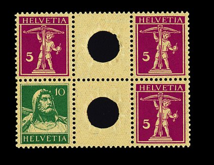 1598 og/nhbl S19, S21 imageZumstein #S19, S21, 1921 5c Violet, 10c Green, gutter pair with large round punch, block of two pairs, the top pair being two 5c stamps, while the bottom pair is a 10c and 5c, well centered, o.g., top right stamp lightly hinged, everything else n.h., extremely fine; the two gutter pairs in themselves are quite scarce, but a "se-tenant" block such as this is truly rare; 1952 Zumstein and 1995 Marchand certificates. (Image) 4,125SF+