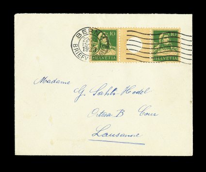 1599 c S22 imageZumstein #S22, 1921 10c Green, gutter pair with small round punch, tied by "Bern/Briefversand/22-23/15-VI 1923" machine cancel on cover to Lausanne, very fine; scarce on cover; 1985 Trussel certificate. (Image) 1,800SF