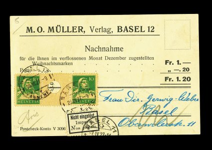 1600 c S26 imageZumstein #S26, 1921 10c Green, gutter pair with small round punch, tied by "Basel 11/Kannenfeld/8.IV.27" c.d.s. postmarks on local postcard, Bachletten backstamp, postcard was soliciting Christmas Seal purchases, very fine. (Image) 450SF