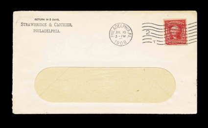 281 PBPBPB 320H image#320H, 2c Carmine imperforate coil, horizontal format, single with large well balanced margins, tied to neat "Strawbridge & Clothier/Philadelphia" corner card cover by choice strike of "Philadelphia, Pa./Jul 10, 1908" wavy line machine postmark (the earliest documented usage of this stamp), stamp with distinctive characteristics of an imperforate coil, extremely fine and very scarce on cover. (Image) Est. 400-500