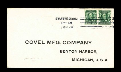 282 c 314 image#314, 1c Blue green imperforate, with Covel Manufacturing private perforations, horizontal pair with vertical Covel perforations, tied to clean Covel printed return address cover by "Evansville, Ind./11 AM/Jan 6 -16" machine postmark, very fine and choice. (Image) Est. 200-300