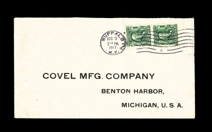 283 c 314 image#314, 1c Blue green imperforate, with Covel Manufacturing private perforations, a most unusual vertical pair with horizontal Covel perforations, tied to clean Covel printed return address cover by "Buffalo, N.Y./Aug 9, 1917" wavy line machine postmark, very fine; this is the only Covel cover we have seen with a #314 pair in a vertical format and is one of only three such covers recorded; 1997 PF certificate; ex-Agris. (Image) Est. 400-500