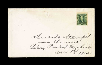 286 c 300 image#300, 1c Blue green affixed to cover by Pitney Postal Machine Co. envelope sealing and stamp affixing device, Arthur H. Pitney's envelope sealing mechanism was granted Patent No. 735,514 on August 11, 1903 and the Post Office Department in Washington, D.C. used this sealer for a time, as did Mandel Bros. and Carson Pirie, Scott & Co. until 1908; however only one Pitney stamp affixing unit was built for use with the sealer, this unit was first tested on December 8, 1905 by Montgomery Ward & Co. of Chicago, a patent filing for this affixing device, listing Pitney as inventor, was not granted as it was found to interfere with other applications at the time; this is one of only two covers that are reported to exist that are identified with this affixing device, both have uncancelled One Cent 1902 Series stamps and are inscribed in Arthur Pitney's handwriting "Sealed & Stamped on the new Pitney Postal Machine, December 8th, 1905"; a fascinating and historical artifact of this time of great experimentation with the automation of bulk mailings. (Image) Est. 750-1,000