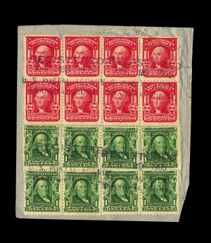 290 O 300, 319 image#300, 319, 1c Blue green and 2c Carmine, Ty. I, eight copies of each stamp (1c in singles and pairs, 2c block of eight), tied to small piece of linen envelope by scarce four line "Registered/Apr 29, 1905/U.S. Postal Agency/Shanghai, China" black handstamp, piece creased and a bit wrinkled causing faults to three 2c stamps, still an attractive and unusual usage; ex-Hanschen. (Image) Est. 150-200