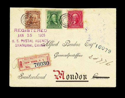 291 c 300-01, 307 image#300-301, 307, 1c Blue green, 2c Carmine and 10c Pale red brown, nicely centered singles of each tied to exceptionally attractive and colorful registered cover to Moudon, Switzerland by black target cancels, 10c stamp also tied by superb strike of violet four line "Registered/Jan 15, 1906/U.S. Postal Agency/Shanghai, China" handstamp, San Francisco and New York transit postmarks, as well as a Moudon arrival c.d.s. all neatly struck on reverse, very fine and exceedingly choice; cover accompanied by original sender's registry receipt. (Image) Est. 300-400
