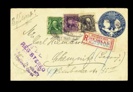 292 c 300/306 image#300, 302, 306, 1c Blue green, 3c Bright violet and 8c Violet black, all tied to 1c Columbian Exposition stamped envelope (#U348) by multiple blurred strikes of "U.S. Postal Agency/R.D./Shanghai, China" oval postmarks, sent registered to Chemnitz, Germany, matching four line "Registered/Feb 16, 1907/U.S. Postal Agency/Shanghai, China" violet handstamp at bottom left, New York transit and Chemnitz arrival c.d.s. on reverse, fine; a very scarce combination of values used commercially from Shanghai; ex-Marx. (Image) Est. 200-300