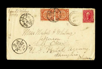 293 c 301 image#301, 2c Carmine, single used on dual franking cover with Chinese stamps, sent from Peking, China to Jefferson, Ohio via Shanghai, vertical pair of China 1c Ochre (#111) tied by Peking c.d.s in Chinese paying postage to Shanghai, then U.S. 2c stamp used to pay postage from Shanghai to the U.S. and tied by "Shanghai, China/Jun 20, 1904/U.S. Postal Agency" duplex postmark, Shanghai and San Francisco transit postmarks on reverse along with Jefferson, Ohio arrival c.d.s., cover with slight edge wear and wrinkles (slightly affecting U.S. stamp), fine and scarce. (Image) Est. 400-500
