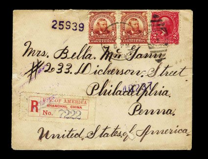294 c 301, 303 image#301, 303, 2c Carmine and 4c Brown, a single of the former and a horizontal pair of the latter (natural s.e. at bottom), tied to registered cover to Philadelphia by "Shanghai, China/May (?), 1904/U.S. Postal Agency" duplex cancel, cover used with very rare locally printed "U.S. of America/Shanghai, China/R" registry label, San Francisco transit and Philadelphia arrival c.d.s. on reverse, stamps with trivial flaws and cover with small facial nick at bottom, still very fine; the first example of this registry label we have seen used on a cover franked with the 1902-03 Issue. (Image) Est. 500-750