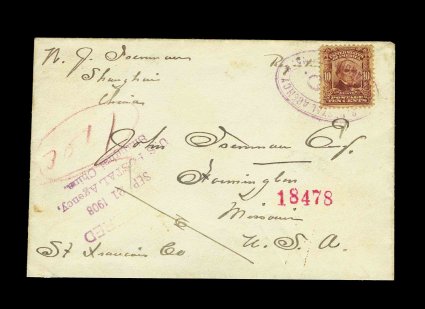 295 c 307 image#307, 10c Pale red brown, well centered single tied to registered cover to Farmingham, Mo. by violet oval "U.S. Postal Agency/R.D./Shanghai, China" postmark, matching four line "Registered/Sep 21, 1908/U.S. Postal Agency/Shanghai, China" handstamp at bottom left, Seattle transit and Farmingham arrival c.d.s. on reverse, very fine; ex-Marx. (Image) Est. 200-300