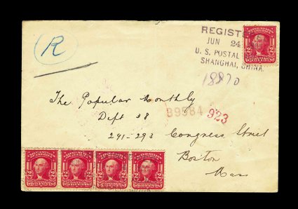 296 c 319 image#319, 2c Carmine, Ty. I, horizontal strip of four and a single (paying correct 10c registry rate) tied to registered cover to Boston, Mass. by three strikes of black four line "Registered/Jun 24, 1905/U.S. Postal Agency/Shanghai, China" handstamps, with no other Shanghai postal markings, Seattle transit c.d.s. on reverse, cover with mild central vertical file fold just affecting one stamp and a couple of usual filing pin holes, a fine and scarce usage. (Image) Est. 200-300