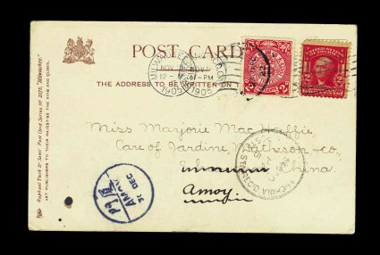 297 c 319 image#319, 2c Carmine, Ty. I, centered a bit to bottom, tied to picture post card originally addressed to Shanghai, China by "Milwaukee, Wis./Nov 15, 1905" machine cancel and San Francisco transit postmark as well, Shanghai arrival c.d.s., post card was reposted for forwarding to Amoy with Chinese 2c Scarlet (#112) and tied by indistinct c.d.s, clear Amoy arrival c.d.s. at bottom left, very fine and scarce. (Image) Est. 150-200