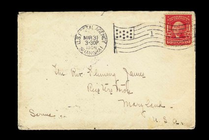 298 c 319c image#319c, 2c Scarlet, Ty. I, single tied to cover to Reisterstown, Maryland by excellent strike of "U.S. Postal Agency/Mar 31, 1906" machine flag cancel, being the sole existing example of the Shanghai machine flag cancellation, Seattle transit cancel and Reisterstown arrival c.d.s. on reverse, tiny edge tear to cover at top, fine; one of the most important cancellations known from the U.S. Postal Agency in China. (Image) Est. 2,000-3,000