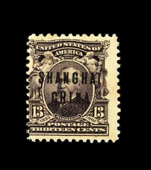299 og 308 image#308, 13c Purple black, with Darrah "Shanghai/China" black overprint, mint single, the only value from the 1902-03 Regular issue series (plus the Special Delivery value) with this sought-after overprint, centered to left, o.g., h.r., fine; thought to be one of less than a dozen examples known; this unauthorized local overprint by John M. Darrah, the U.S. Shanghai postal agent, was withdrawn from sale one week after issuance by the order of the Post Office in Washington, D.C. (Image) Est. 400-500