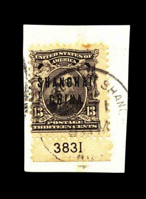 300 O 308 image#308, 13c Purple black, with Darrah "Shanghai/China" black overprint, an exceedingly scarce used example of this value, being a bottom sheet-margin plate no. 3831 single, tied to small piece by U.S. Postal Agency Shanghai, China c.d.s., stamp centered to left, very slight toning around a couple of perf. tips, fine; this, and the example found in the next lot, are the only used examples of this value we have ever seen. (Image) Est. 400-500