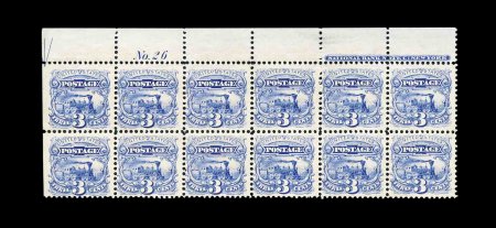191 ogPB 114 image#114, 3c Ultramarine, a pristine full top margin imprint, half arrow and plate "No. 26" block of twelve, wonderfully bright and fresh, with deep rich color and prooflike impression, strong and intact perforations, quite well centered, particularly for a classic 19th century plate block, full clean o.g. which shows interesting split grill impressions well, lightly hinged on three stamps only, rest n.h., very fine and choice; one of the finest quality Three Cent 1869 Pictorial plate blocks to come on the market in quite some time; Chapin census #330; 1988 PF certificate. (Image) 8,150.00+