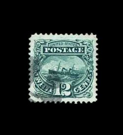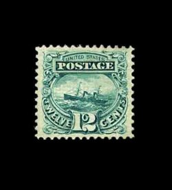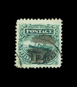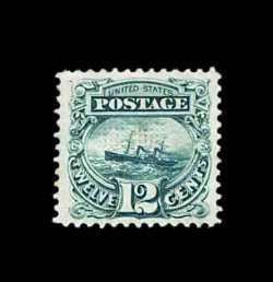 205 og 117 image#117, 12c Green, a magnificent mint example, possessing outstanding centering within exceptionally large margins for this value, wonderfully bright and fresh overall, with unusually deep color in a "sage" green shade, prooflike impression, full o.g., lightly hinged, extremely fine; an impressive quality original gum Twelve Cent 1869 Pictorial; 2001 PF certificate. (Image) 2,500.00