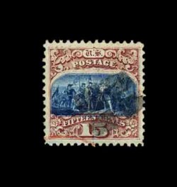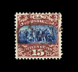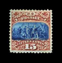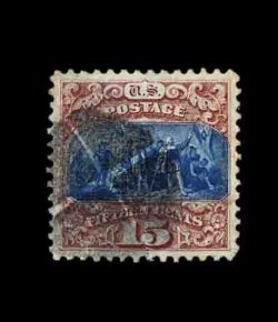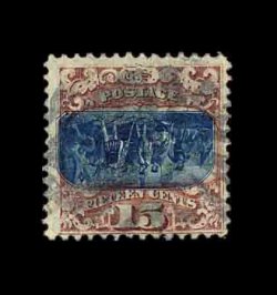 209 ng 118 image#118, 15c Brown and blue, Ty. I, a very scarce unused example, well centered although reperforated at right, strong rich color and a clean impression, red handstamps on back just show through to front, very fine appearance; #118 is the most difficult of all the 1869 Pictorials to find in unused condition. (Image) 3,750.00