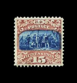 212 og 119 image#119, 15c Brown and blue, Ty. II, uncharacteristically well centered, warm rich colors, certificate states "slightly disturbed o.g." although it has full o.g. with just a removed hinge, very fine; #119's are seldom found this well centered and still retaining their original gum; 2000 PF certificate. (Image) 3,500.00