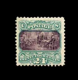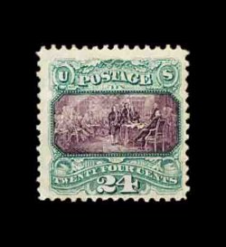 216 og 120 image#120, 24c Green and violet, nicely centered within large margins, strong colors and impression, full o.g., lightly hinged, a very fine example of this very rare mint classic; 1987 PF certificate. (Image) 7,500.00