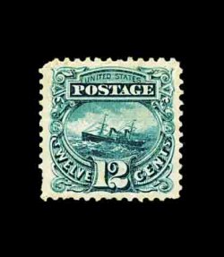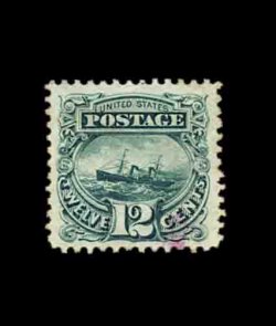 245 O 128 image#128, 12c Green re-issue, a fabulous quality example of this very rare used re-issue, being in a condition that is virtually unheard of on any of the known used 1869 Pictorial Re-issues, magnificently centered amid lavishly large margins, eye-arresting color in an incredibly deep shade, plus its impression is deeply etched on bright paper, superbly postmarked with a light magenta cancel at bottom, leaving the central vignette cancel free, a superb stamp for the finest used collection; Jon Rose, in his exceptional United States Postage Stamps of 1869 handbook, estimates that only 15-25 used Twelve Cent Re-issues exist and, in our opinion, there exists no finer than the copy offered here; 1991 and 2002 PF certificates; ex-Morris. (Image) 2,750.00