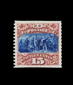 248 ng 129a image#129a, 15c Brown and blue re-issue, Ty. III, imperforate horizontally, a highly select unused example of this immensely rare variety, possessing outstanding centering within exceptionally wide margins, sumptuously rich colors and prooflike impressions, extremely fine; according to Jonathan W. Rose, in his outstanding handbook United States Postage Stamps of 1869, he estimates that there are only five to ten in existence, and most are typically found without gum; with such a tiny number known the catalog value does not accurately reflect this stamp's true rarity; 2002 PF certificate. (Image) 3,000.00