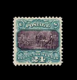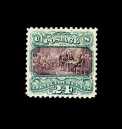 249 og 130 image#130, 24c Green and violet re-issue, a highly select mint single of this very scarce re-issue, with an exceptional overall freshness, gorgeous rich colors and strong detailed impressions on fresh paper, exceedingly well centered within large margins, full o.g., lightly hinged, extremely fine; one of the finest quality original gum examples available of the 2,091 issued; 1996 PF certificate. (Image) 3,000.00
