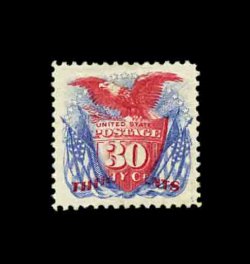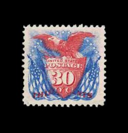 251 og 131 image#131, 30c Blue and carmine re-issue, a spectacular mint example of this re-issue, featuring striking vibrant colors and a prooflike impressions on fresh white paper, plus it is remarkably well centered within lavishly large margins, full clean o.g., lightly hinged, extremely fine; a gem in every regard; certainly among the very finest of the 1,535 issued; 2001 PF certificate. (Image) 3,000.00
