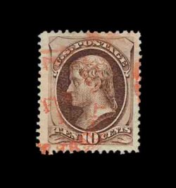 259 O 139 var. image#139 var., 10c Brown with "I" grill, an incomparable used example that is surely among the very finest that exist, possessing outstanding centering amid absolutely immense margins that are almost unheard of on any of the grilled Bank Notes, wonderfully rich color and impression that is exquisitely contrasted by a vivid red circular datestamp, in addition to being a spectacular quality used example of this value, this stamp bears an easily identifiable "I" grill, which is far more more elusive to find than the more typically seen "H" grill, which currently is the only grill listed in the Scott catalog, despite the rarity and collectability of the "I" grill (to date only six examples of the Ten Cent value with an "I" grill have been identified, with this example, being, by far, the finest recorded), extremely fine; a stunning gem for the finest collection; 1962 and 2002 PF certificates (the latter specifically identifying this as the "I" grill variety); ex-Engel, "Connoisseur" Collection, Renne and Floyd. (Image) as normal grill 675.00+