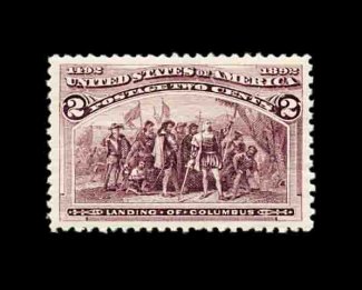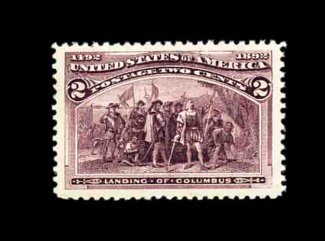 375 nh 239 image#239, 30c Columbian, an eye-catching mint single that possesses numerous physical characteristics that few other Thirty Cent Columbians enjoy, beginning with its flawless centering within extravagantly large margins, plus it has rich luxuriant color and a highly detailed impression, unblemished o.g. without a single gum bend or skip, n.h., an extremely fine gem in every regard; an outstanding stamp for the perfectionist; 2001 PF certificate. (Image) 650.00