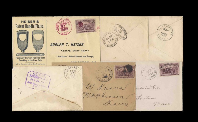 364 OOc 231 #231, 2c Columbian railroad postal history collection, attractively written up on pages for exhibition, this collection documents some rare and scarce markings of the rail postal system using covers franked with the popular 2c Columbian, this issue comes into use just as the railway post office service was reaching its height, so it is appropriate to use this issue to show the markings, this collection contains over 130 covers and starts appropriately with an attractive all-over Columbian Exposition illustrated cover, the other covers are collected for their railway markings, and this is only added to by the numerous interesting corner cards and advertisements, we note 35 covers with illustrated advertising, this collection concentrates on scarcer and more elusive marking including some that were applied in transit including receiving markings, some of which are in scarce colors as red, violet and green, there are scarce distribution center markings as "Chicago & St. Louis R.P.O./Chicago Dis.", also transfer clerk markings including a rarely seen rimless variety, some show mail detention messages such as very rare "Chicago, Ill./Received/Mail Delayed/E/Train Late" duplex (only two reported examples), also includes "Fast Mail" designations at this time when speed of service was increasingly important, one interesting marking of which there are only a few known is "Chi. City, Chi. & Cinc./F. Mail" with an outer rim that reads "Mail Delayed/Train Late", we also note the discovery examples of "Roanoke, Va/Transit" which was previously unlisted, two frames of this exhibit concentrate on scare "R.P.O." cancels of railroads of very short length, often less than 100 miles, some of the scarcer we note include "Alton Bay & Dover/R.P.O." (28 miles), "Belfast & Burnham/R.P.O." (34 miles), "Sparta & Viroque/R.P.O." and "Selma & McPhersen/R.P.O. (both 36 miles) and "Greenville & Laurens/R.P.O." (37 miles), plus others, numerous markings are of different size and configuration than listed or not previously listed at all, there is far too much to list everything specifically, but color photocopies are available for examination by interested bidders; also includes over 50 stamps with various obliterators used on railroad cancels, some indicating directions, etc., condition varies as would be expected for covers of this period and with markings that are extremely scarce, but large portion are fine-very fine and attractive. (Image) Est. 4,000-5,000