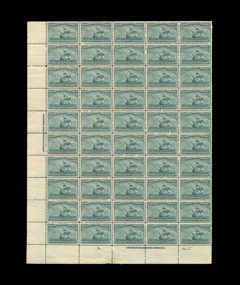 365 nhbl 232 #232, 3c Columbian, bottom left plate "No. 57" pane of 50, a remarkably choice sheet, with most stamps being very well centered, bright and fresh, o.g., n.h., a couple areas on the edge of the sheet have had separated perfs. sensibly reinforced, very fine-extremely fine; rarely encountered anymore in a full sheet, particularly in this impressive quality; quite likely one of the finest quality Three Cent Columbian panes still remaining intact. (Image) 7,140.00+