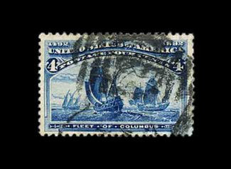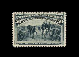 380 O 240 image#240, 50c Columbian, used, outstanding centering within uncommonly large margins, intensely rich color and a razor-sharp impression, unusually light and unobtrusive c.d.s. postmark at top, extremely fine; an especially desirable used example possessing great eye appeal; 1983 PF certificate. (Image) 160.00