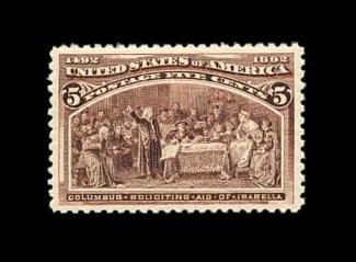 367 nh 234 image#234, 5c Columbian, flawlessly centered amid extravagantly large margins, striking deep luxuriant color and a razor-sharp impression, o.g., n.h., extremely fine; a gem never hinged Five Cent Columbian for the perfectionist; 2002 PF certificate. (Image) 190.00