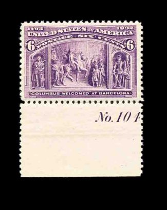 370 og 235 image#235, 6c Columbian, bottom sheet-margin plate "No. 104" single, incredibly well centered amid extravagantly large margins, gorgeous intensely rich color and a razor-sharp impression, pristine o.g., barest trace of hinging, extremely fine gem; a stamp with great eye appeal; 1992 PF certificate. (Image) 85.00