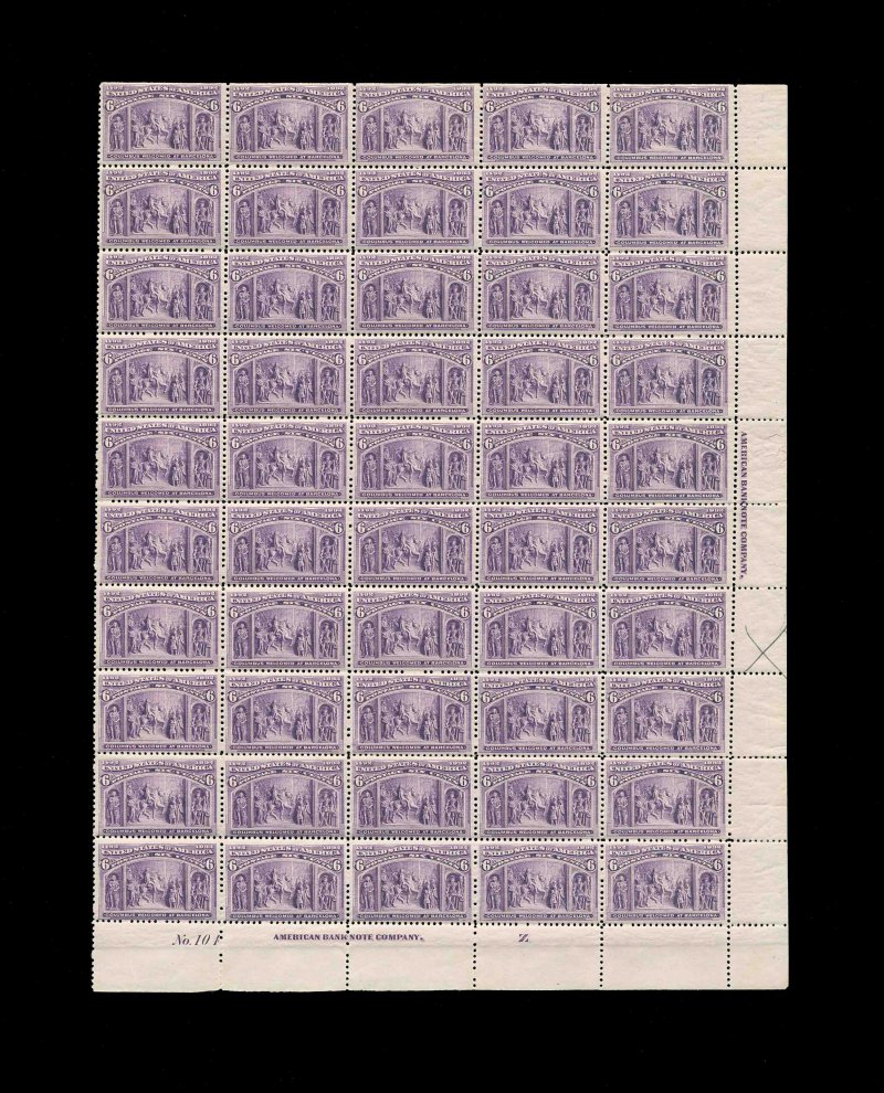 371 og/nhbl 235 #235, 6c Columbian, bottom right plate "No. 104" pane of 50, exceptionally fresh, with strong rich color on clean white paper, many well centered stamps, o.g., eight stamps lightly hinged (including the first three stamps on the eighth and ninth rows), others n.h., small pencil mark in right selvage, very fine; the 6c value is especially difficult to find in a full pane. (Image) 9,120.00+