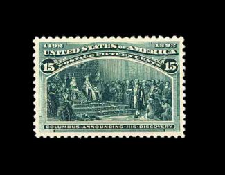 374 nh 238 image#238, 15c Columbian, an impressive mint example that features large and perfectly balanced margins all around, deep rich color and a well incised impression on clean white paper, o.g., n.h., extremely fine; 1997 PF certificate. (Image) 480.00