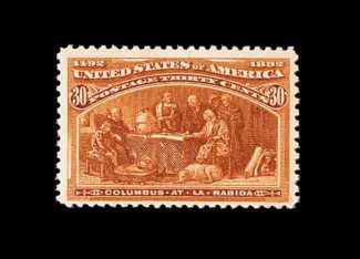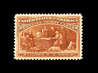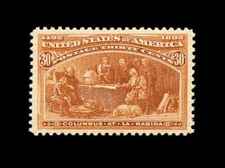 377 nh 239 image#239, 30c Columbian, spectacularly intense color and a vivid impression, nicely centered within large margins, o.g., never hinged, very fine; 1983 PF certificate. (Image) 650.00