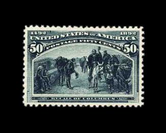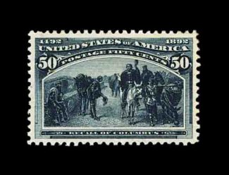 378 og 240 image#240, 50c Columbian, a highly select mint single that is essentially perfectly centered within uncommonly large margins, plus its color is especially deep and luxuriant and its impression deeply etched, full o.g., lightly hinged, extremely fine; a difficult stamp to find in this premium quality; 2000 PF certificate. (Image) 600.00