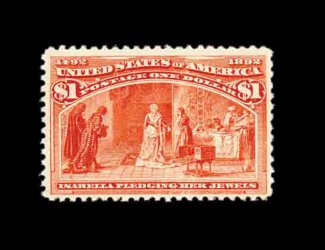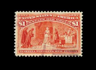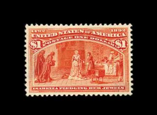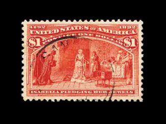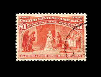 383 O 241 image#241, $1.00 Columbian, a striking used single, featuring numerous eye-appealing qualities, including its outstanding color, being an incredibly deep "fiery" red shade, in addition it has a deeply etched impression and is exceedingly well centered within extravagantly large margins that are most uncharacteristic, an unusually light and unobtrusive c.d.s. cancel further contributes to this stamp's high desirability, an extremely fine gem for the collector who seeks out only the finest quality used stamps; 2002 PF certificate. (Image) 650.00