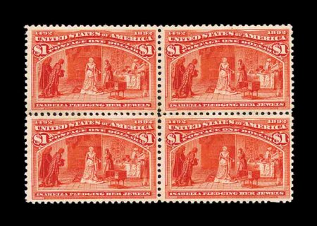 382 og(bl) 241 image#241, $1.00 Columbian, a handsome and exceptionally fresh mint "block" of four, being two horizontal pairs skillfully rejoined, quite well centered, gloriously rich color and impression, full pristine o.g. that shows just the barest trace of hinging, very fine; 1999 PF certificate. (Image) as singles 5,200.00+