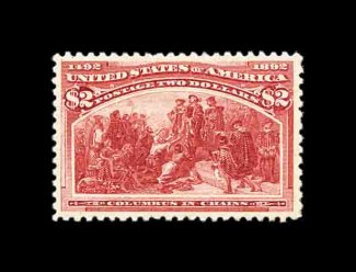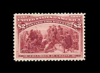 387 og 242 image#242, $2.00 Columbian, extraordinarily well centered within large margins, sumptuously rich color and a highly detailed impression, o.g., lightly hinged, extremely fine; an impressive original gum Two Dollar Columbian; 2002 PF certificate. (Image) 1,400.00