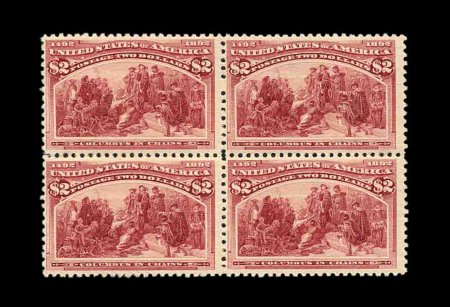 389 og/nhbl 242 image#242, $2.00 Columbian, fresh mint block of four, rather well centered, deep luxuriant color and a crisp impression, pristine o.g., left pair faintly hinged (if at all), while the right pair is never hinged, fine-very fine; 1985 PF certificate. (Image) as singles 9,800.00+