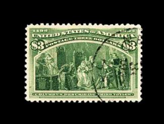 393 O 243 image#243, $3.00 Columbian, used, exceedingly well centered amid large margins, beautiful rich color and a deeply etched impression on fresh white paper, light town c.d.s. postmark, extremely fine; an especially handsome used example; 1987 PF certificate. (Image) 1,100.00
