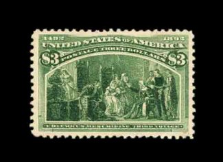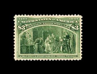 395 og 243a image#243a, $3.00 Columbian, the olive green shade, extraordinarily well centered within uncharacteristically large margins, lovely rich color and a strong impression, full clean o.g., lightly hinged, extremely fine and quite handsome; 2001 PF certificate. (Image) 2,100.00